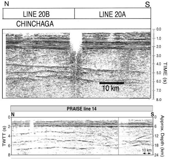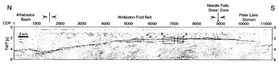 (Top) the Winagami reflection sequence revealed by LITHOPROBE reflection profiling in Alberta, NW Canada [59]. (Bottom) presumably correlative northward extension of the Winagami reflectors mapped by LITHOPROBE 3D seismic profiling [61].