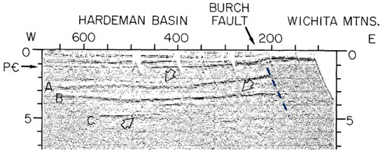Layered reflectors traced by COCORP seismic profiles in northern Texas and southern Oklahoma [66]. P-C indicates the top of Precambrian basement from local boreholes. Arrows mark the reflective sequence (A, B, and C), here interpreted as mafic sills. Dashed line indicates the apparent truncation of basement reflections along the Burch fault of the Wichita Mountains.