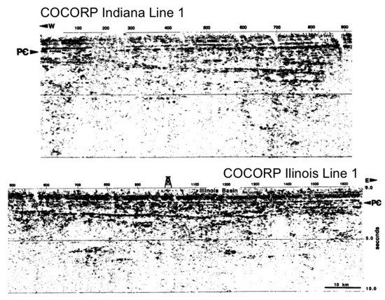 The very first COCORP profiles were carried out in Hardeman County, northern Texas (Figure 1 [65]. The most notable discovery of those surveys was a distinctive sequence of subhorizontal reflections in the uppermost crystalline basement. These reflections were traced by subsequent COCORP surveys well into southern Oklahoma, where they are abruptly truncated by the Wichita Uplift (Figure 8). The extensive, layered nature of these reflections was initially interpreted to suggest a Proterozoic sedimentary or metasedimentary origin [66]. A supracrustal interpretation was reinforced by the observation of similarly layered reflections on COCORP seismic reflection profiling in Indiana, Illinois, and Ohio (Figure 1 and Figure 9 [67]) and oil industry data in eastern New Mexico (Figure 1 and Figure 10 [68,69]). The vast extent implied by correlating these layers from eastern New Mexico to central Ohio (Figure 11) is consistent with a depositional origin, although the apparent spatial correlation of these layers with the 1.5 MYA Granite-Rhyolite province [70] suggest the possibility that volcanic material (rhyolite?) rather than sedimentary rocks is involved [67]. However, the similarity of the Texas reflections to the Siljan images (compare Figure 8 with Figure 5) has continued to raise the question as to whether this midcontinent basement layering is actually a series of diabase sills.