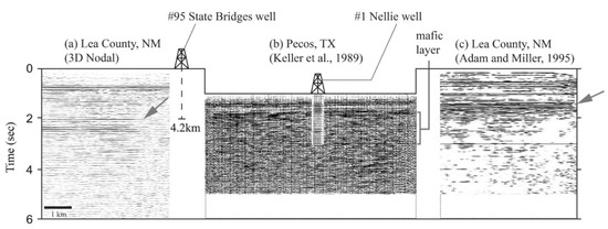 (Left and Right) layered basement reflections from the reprocessing of oil exploration seismic data from east central New Mexico [68,69]. (Center) oil industry drilling has identified correlative layered reflectors in southwest Texas as being from layered ultramafic rocks [71]. After Kim and Brown [69].
