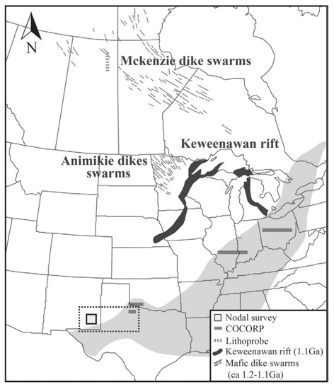 Kim and Brown [69] revisited this issue in their interpretation of basement layering imaged by the reprocessing of 3D oil exploration seismic data in eastern New Mexico. Strong intrabasement reflections were reported from previous work by Adams and Miller [68] on 2D oil industry seismic data located nearby (Figure 10). Both of these papers referenced observations from an oil industry drillhole in southwest Texas that encountered layered ultramafic rocks at depths that seem to correspond to the basement layering in New Mexico (Figure 10 [72]). The ultramafic rocks recovered from the borehole were found to be of Keweenawan age (1.1635 Ga; [71]). Ernst and Buchan [73] describes links between layered ultramafic bodies and large-scale sill/dike intrusions. Kim and Brown ([69]) suggest that the southwest Texas borehole “calibration”, the similarity in appearance of the upper basement layering on COCORP seismic data from New Mexico to Ohio, together with their similarity to the Siljan results support their interpretation as mafic sills associated with the Keweenawan plume. If correct, this interpretation indicates lateral injection of Keweenawan magma in the upper crust of the central US on a continental scale (Figure 11). Kim and Brown [69] point out this extent is comparable to the spatial extent of the McKenzie dikes in NW Canada [62] which are presumably from the same plume source as the Wollaston Lake reflector (Figure 11).