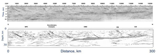 IBERSEIS deep seismic reflection profile tracing a prominent midcrustal reflection sequence beneath the Iberian Massif [74]. Top: time migrated seismic section. Bottom: line drawing.