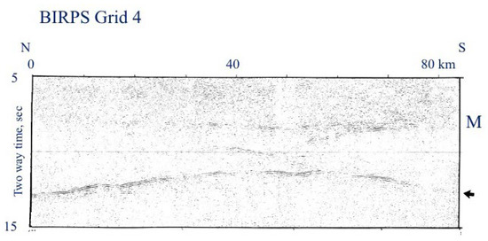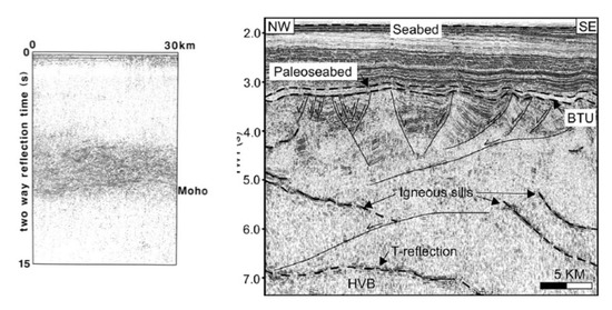 Although the mantle has proven far less heterogeneous than the crust, at least in terms of reflectivity, prominent mantle reflections have now been traced by a number of seismic reflection profiles. Perhaps the best known of these have been mapped by the BIRPS (British Institutions Reflection Profiling Syndicate) in northwestern Britain [79,80,81]. The mantle reflections which have received the most attention are dipping features, often interpreted as “fossil” subduction zones [82,83,84,85]. However, relative extensive subhorizontal reflections have also been observed in the mantle near Britain which resemble those in the upper crust that have been interpreted as sills (e.g., Figure 13). Some of these “flat” mantle reflections are spatially linked to the nearby dipping mantle reflections [86] and thus may be genetically related. In any case, they too may represent igneous sills, although other speculative explanations have been put forward (e.g., detachments [87]).