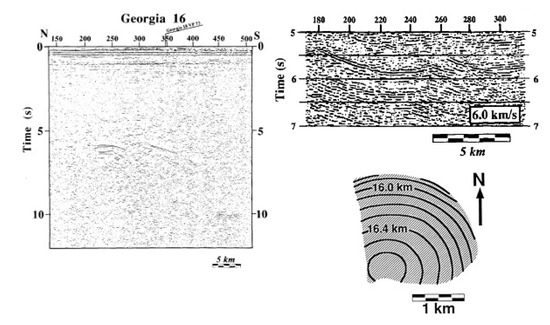 A number of mafic sills in both outcrop and seismic sections from basins exhibit a characteristic “saucer” shape which has fueled recent discussion about intrusion mechanics in sedimentary sequences [4,27,29,93,94]. This distinctive saucer shape has also been reported for intrabasement reflections on a several deep seismic profiles [48,95,96]. Figure 15 shows one particular distinctive example, the Surrency Bright Spot (SBS) encountered during a COCORP survey of the inferred suture zone between Laurasia and Gondwanaland buried beneath the coastal plain sedimentary rocks of southeastern Georgia. The strong amplitude of this spatially limited reflection was originally interpreted to indicate fluid involvement [95] though magma was ruled out due to its location on a long inactive passive continental margin. The saucer shape of the SBS (Figure 15) is now recognized as identical to that documented not only in oil industry 3D seismic data for various sedimentary basins but in notable outcrops of mafic intrusions [27]. The presence of saucer-shaped reflectors deep in the continental basement provides new context to evaluate mechanical models proposed to explain this geometry within sedimentary strata [4,38,93]. Thus the SBS (Surrency Bright Saucer?) is most likely a mafic intrusion, perhaps emplaced during the rifting of the Atlantic margin.