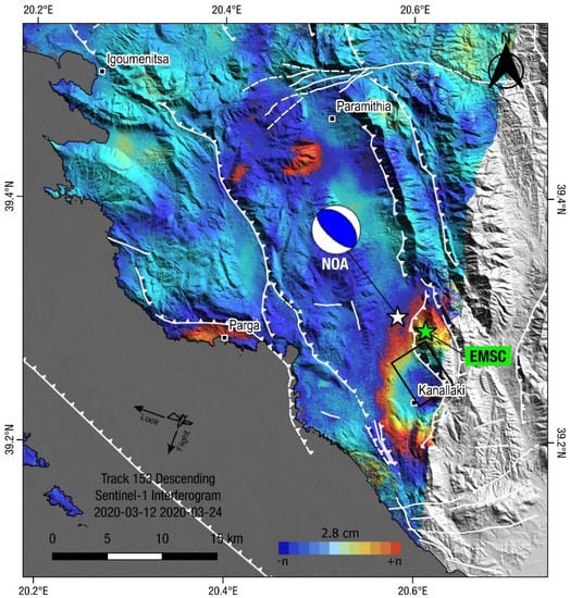 Valkaniotis, S.; Briole, P.; Ganas, A.; Elias, P.; Kapetanidis, V.; Tsironi, V.; Fokaefs, A.; Partheniou, H.; Paschos, P. The Mw = 5.6 Kanallaki Earthquake of 21 March 2020 in West Epirus, Greece: Reverse Fault Model from InSAR Data and Seismotectonic Implications for Apulia-Eurasia Collision. Geosciences 2020, 10, 454. https://doi.org/10.3390/geosciences10110454