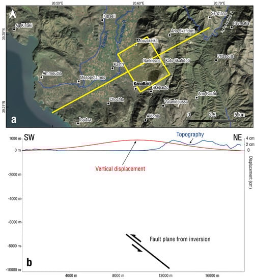 - Ilieva, M.; Briole, P.; Ganas, A.; Dimitrov, D.; Elias, P.; Mouratidis, A.; Charara, R. Fault plane modelling of the 2003 August 14 Lefkada Island (Greece) earthquake based on the analysis of ENVISAT SAR interferograms. Tectonophysics 2016, 693, 47–65. [Google Scholar] [CrossRef]