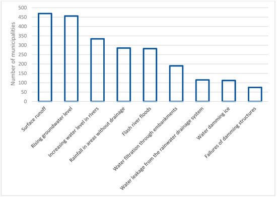 During the research carried out by the authors [19], before the publication of the first flood risk management plans, municipalities were surveyed in terms of flood hazard, in order to identify its main sources. Among the endangered municipalities, more than a half indicated water runoff on the ground surface caused by rainfall and rising groundwater levels as the main cause of losses: 63% (469) and 61% (456) municipalities, respectively. The cause of “accumulation of water from rainfall in non-drainage areas” was also high in the ranking, as indicated by 285 (38%) municipalities. “Relatively slow rise in the water level in the river” and “rapid river floods” were indicated by 45% (334) and 38% (282) municipalities, respectively. Figure 1 presents the questionnaire results.