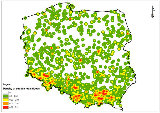 In order to illustrate the spatial extent of the effects of high-intensity rainfall, a map of rainfall flooding density was developed. Figure 2 shows the spatial differentiation of the occurrence of rainfall floods in Poland. The source of data relating to precipitation and its consequences was the sudden local floods and high-efficiency precipitation information layer developed in the GIS standard as part of the project implemented by the Institute of Meteorology and Water Management-National Research Institute, titled “Impact of the climate change on the environment, economy and society” (changes, impacts, ways of limitation, proposals for science, engineering in practice and economy planning) [22]. High-intensity rainfall was defined as stormy rainfall with a height of at least 20 mm, lasting no more than 12 h, and which resulted in local flooding, or flooding causing specific damage to environmental infrastructure and the economy.