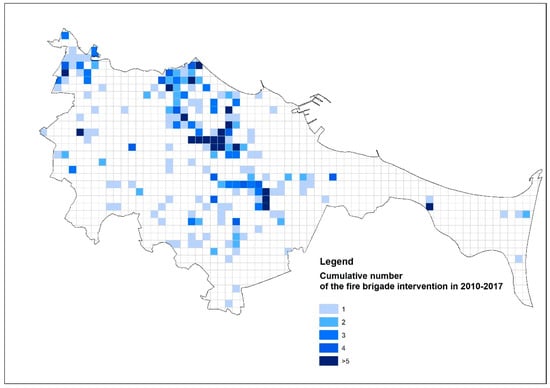 In this paper, the fire brigade intervention database was used as a supplement, for the proposed methodology. However, it should be emphasized that fire brigade interventions may be the subject of separate analyses related to the study of the correlation between fire brigade intervention sites and the sealing of the surface of the city of Gdansk.