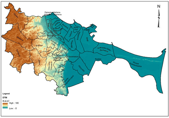 Gdansk is situated on the coast of the Baltic Sea, directly on the Bay of Gdansk, and at the mouth of the Motlawa River, a tributary to the Vistula River [24]. The city is located within four different physical and geographic units according to J. Kondracki’s division [25]. Generally, the level of the terrain within the city of Gdansk reaches about 180 m above sea level. The levelling of the terrain within one slope (local) is much smaller, but may also exceed 50 m in several places, while local variations of 30–40 m are common. Figure 4 shows a hypsometric map of Gdansk. The location of Gdansk within such different physical and geographic units means that the city is characterized by a large spatial diversity: topography, geological structure, hydrographic system, local climate conditions and vegetation cover. This is due to the presence of slopes with a maximum slope above 30 degrees [26]. In the spatial structure of the city, one can distinguish the so-called lower terrace the upper terrace, separated by a highly fragmented edge zone of the plateau, where the differences in relative heights reach up to 100 m [24].