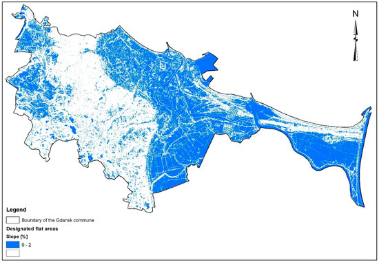 A DTM with a mesh resolution of 1m × 1m was used to determine flat areas (i.e., those with a slope of less than 2%). Then, resampling of the DTM grid was carried out, a raster with a resolution of 10 m × 10 m was obtained as a result of which (Please see the Appendix A). Then, its value was reclassified, in order to distinguish those areas whose decrease was less than 2%. The result of this analyses was the assessment of each area of the grid, the mesh size of which was less than 2%. Figure 6 shows the designated flat areas.