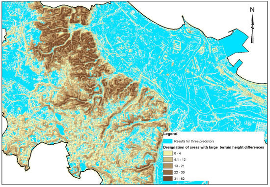 A DTM with a mesh resolution of 1m × 1m (pixel type: integer), was used to determine areas with large terrain height differences. In order to determine the greatest height differences, a neighbourhood analysis (Focal Statistics) was performed. The result of this part of the analysis was the development of a grid in which the value of each cell represented the difference in height between the largest and smallest cell values in its vicinity. A square with dimensions of 100 × 100 was adopted as the shape of the neighborhood. Figure 8 shows the designated areas with large terrain height differences.