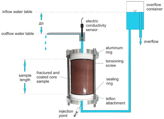 All Darcy and tracer experiments were performed under the same boundary conditions to conduct reproducible experiments in a laboratory setup (Figure 1). A pressure difference dh of 0.7 m between inflow at the bottom and outflow at the top of the sample was applied over the sample length dx of 0.15 m. This resulted in a hydraulic gradient i(x) of 4.67. The pressure difference was obtained using an overflow tank and constant recharge. Darcy tests were performed to ensure a constant fluid flux and to determine the flow rate by weighing the volume of water that flowed through the fracture with a laboratory scale (accuracy 0.1 g) in relation to time. The measuring interval was set to 1 min, and the measurement duration was 30 min for the Darcy tests once constant fluid flux was achieved. Tracer experiments were used to determine transport parameters (velocity, dispersivity, dispersion coefficient). The tracer injection was a pulse with a duration of one second with a volume of 1 mL of a 2 molar NaCl solution. The electrical conductivity (EC) was measured at the outflow with a WTW Multi 3510 (Xylem Analytics Germany Sales GmbH & Co. KG, WTW Weilheim, Germany) conductivity logger and an associated Tetracon 925c conductivity sensor (measuring accuracy for electric conductivity 0.5% of the measured value and 0.1 °C for temperature) with an interval of 1 s. To convert the measured electric conductivity of the breakthrough curve into the tracer concentration, a calibration curve was obtained by preparing NaCl solutions of different concentrations (0.001 to 0.02 mol/L). These were then used to measure the resulting electrical conductivity. We achieved a linear regression (c (g/L) = 5.0523 × 10−4 × EC with R2 = 0.9997) for the conversion from conductivity into concentration. The apparatus used for the flow-through experiments is described in more detail in [30].