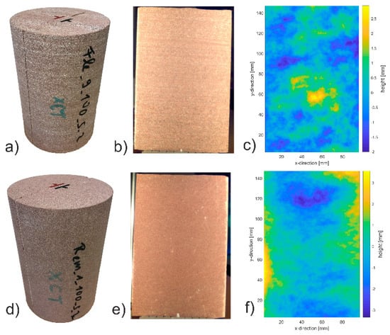 Exemplary fractured samples of Flechtinger (a) and Remlinger sandstone (d), one fracture surface scan of the same Flechtinger (b) and Remlinger (e) sample, and the calculated relative height values based on the surface scan (c,f).