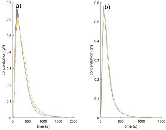 The Remlinger sample showed more high frequency oscillations overlaying the general BTC behavior. Due to the lower transport velocity, the tracer curve had a longer duration of approximately 1800 s to decline to the background concentration. In the shown Flechtinger sample, the background concentration could be observed after approximately 1300 s. Visually, the BTCs of the Flechtinger sample were more difficult to distinguish than the Remlinger BTCs, indicating that the variation between the repeated measurements was smaller. The repeated measurements of the Remlinger sample could be more easily distinguished visually due to the high-frequency oscillations and due to differences in peak concentrations. The BTCs of the Flechtinger tests showed almost no variation in peak concentration and very little variations in the tailing (Figure 4). The onset of the BTC was not quantitatively evaluated but was in agreement with the calculated velocities. The beginning of the BTCs was visibly earlier in the Flechtinger samples than in the Remlinger samples.