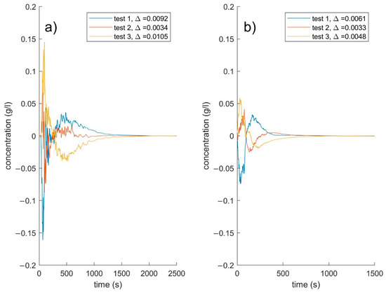 Difference of the three repeated measurements from a common mean BTC for the (a) Remlinger Rem_1_100_S1 and (b) Flechtinger Fle_9_100_S1 with the absolute mean difference Δ.