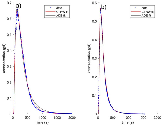 Experimentally obtained BTCs and forward modeling of parameters obtained from the CTRW and ADE fits for (a) Remlinger Rem_1_100_S1 and (b) Flechtinger Fle_9_100_S1.