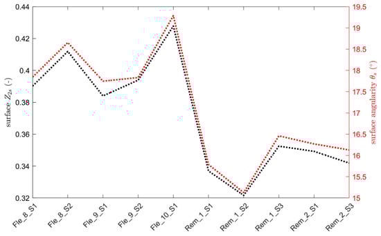 Surface roughness of the fracture surfaces of the 10 tested samples expressed by Z2s and surface angularity.