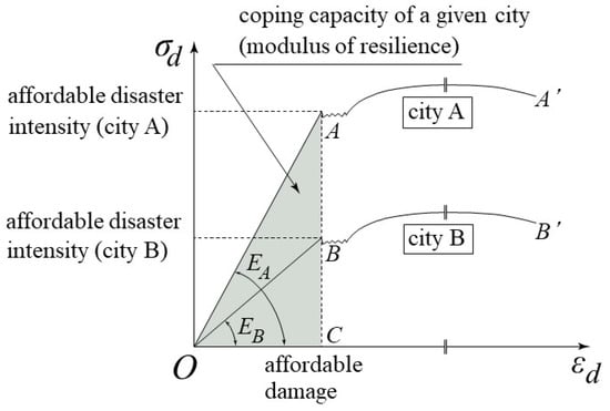 Figure 2 illustrates how city A and B respond differently on intensity of a given disaster. In Figure 2, the curve OAA′ represents the intensity/damage relationship of the city A, while OBB′ represents the city B. In the context of the theory of elasticity, if the stress remains within the proportional limit up to A or B, the area of triangle OAC or OBC represents the modulus of resilience in each case. The modulus of resilience is higher in the A-case than the B-case because EA is higher than EB. The higher the E, the more stress is needed to create the same amount of strain. When the modulus of resilience is higher, k is higher because k is directly proportional to E. We argue that in the context of disasters, the coping capacity, which is the ability to absorb impacts by guarding against or adapting to disasters, corresponds to the spring constant.