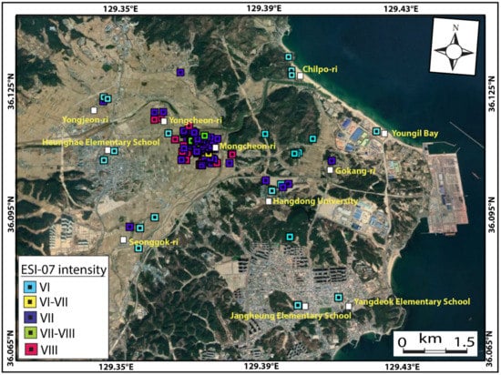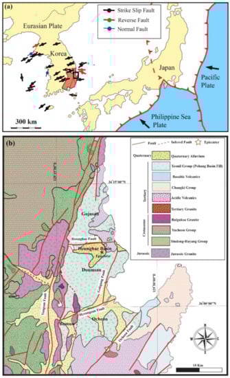 - Naik, S.P.; Kim, Y.-S.; Kim, T.; Su-Ho, J. Geological and Structural Control on Localized Ground Effects within the Heunghae Basin during the Pohang Earthquake (MW 5.4, 15th November 2017), South Korea. Geosciences 2019, 9, 173. [Google Scholar] [CrossRef]