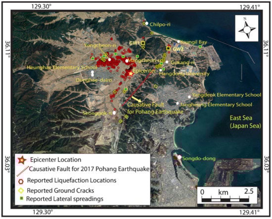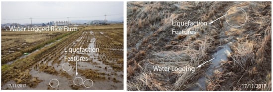- Gihm, Y.S.; Kim, S.W.; Ko, K.; Choi, J.H.; Bae, H.; Hong, P.S.; Lee, Y.; Lee, H.; Jin, K.; Choi, S.J.; et al. Paleoseismological implications of liquefaction-induced structures caused by the 2017 Pohang earthquake. Geosci. J. 2018, 22, 871–880. [Google Scholar] [CrossRef]