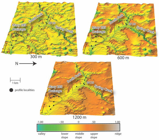 At 1200 m, the part of the landscape classified as valley, i.e., within the South Fork and Spring Creek axes, was concentrated within the escarpment breaks and at higher elevations (Figure 6). At lower elevations away from the breaks along the South Fork axis, the valley classification ceases and instead the South Fork is classified as lower slope. All buried soil profile localities along the South Fork and Spring Creek were classified within the valley class at 600 m. At 1200 m, however, only buried soil profiles at Macy Locality 126 and higher elevations were within the valley classification along the South Fork and Spring Creek axes. Both the 600 m and 1200 m search radius placed the buried soil profiles within the Macy 285 drainage (Figure 6) within the lower to middle slope classes.