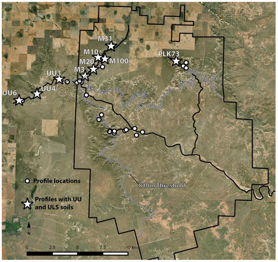 Late-Holocene (~2000 to 800 14C B.P.; Table 1) buried soils were the most common and traceable across both the terraces of the South Fork and the Macy 285 drainage [42]. The predominance of late-Holocene sequences of buried soils also was well documented ~40 km downstream (near Justiceburg; Figure 1) in the westernmost region of the Rolling Plains [43]. In contrast, the UU-age soil (~12,580 to 9100 14C B.P.; Table 1) and ULS-age soil (~6025 to 4600 14C B.P.) were found in only four of the 19 profiles. These profiles were all located in the upper reaches of the South Fork where the valley margin is much narrower.