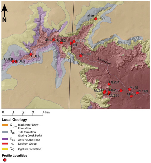 Field reconnaissance yielded 19 soil profile localities based on buried soils and sediments in alluvial parent materials and landscape positions. These localities were natural cut-bank exposures of terrace remnants associated with stream channels and floodplains of the South Fork and Macy 285 drainage. Soils were described and sampled using standard soil survey methods [31,32]. Pedon descriptions were recorded to indicate soil morphology and characterize soil properties. They were documented from the surface to the bottom of the Quaternary-age deposit, or until no dateable material was left to relate the age of the landform.