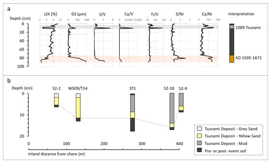 (a) Loss on Ignition (LOI), grain size (GS), and elemental proxies for the core sampled from Satitoa: clear signals of the 2009 SPT are observed at approximately 12 cm core depth. Comparable signals are also observed for a unit at approximately 82 cm, although inconsistencies between the Ti and S patterns between this unit and the 2009 SPT at the surface suggests a different type of coastal process or event origin. (b) Comparison of the inland extent of the 2009 SPT at Satitoa using available sedimentary data: Samples S2-2, WS09/T14, S2-9, and S2-10 shown were derived from []. Sample ST-1 was derived from [] and is discussed in this study.