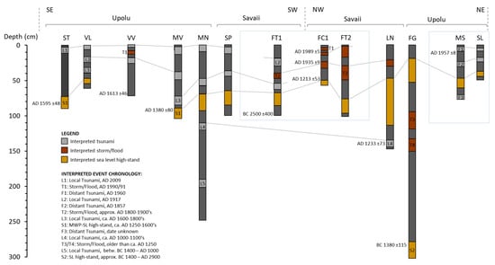 Contemporaneity between identified HEMIs at the investigated sites: the 2009 SPT deposits were confined to the southeast, south, and southwest shores of Upolu as well as southeast shores of Savaii. A distinct S signal consistent across most sites is inferred using geochronological time-markers at Satitoa, Mulivai, Falealupo FC1, and Lano and is interpreted to represent the approximately AD 1000–1500 sea level high-stand to represent ST = Satotia; VL = Vaiula; VV = Vaovai; MV = Mulivai; MN = Manono; SP = Satupaitea; FT1 = Falealupo core site 1; FT2 = Falealupo core site 2; FC1 = Falealupo trench site. LN = Lano; FG = Fagalii; MS = Maasina; and SL = Salimu. Geochronological data shown are provided in Appendix A.
