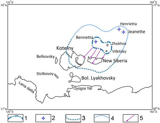 Chart of glaciation of the New Siberian Islands (according to [37]): 1—the boundary of the supposed center of the Middle Neopleistocene glaciation; 2—the position of the modern glaciers; 3—the southern boundary of expansion of the Middle Neopleistocene glacier; 4—the northern boundary of the possible glacier expansion; 5—established directions of glacier movement.