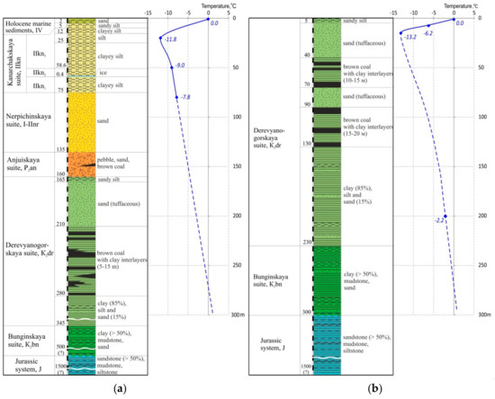 The geological sections per data on boreholes c-B (a), c-A (b) (Figure 1) and the State geological map of the Russian Federation [55] and the temperature data.