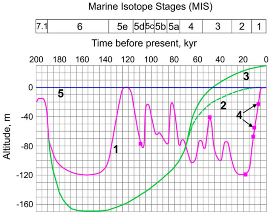 The information on the level fluctuations within MIS-3 is contradictory. Only faunistic data in the East Siberian sector of the Arctic are considered as reliable [64]. They show that the level did not exceed abs. heights of −40 m (4 in Figure 5) Contrast alternating level fluctuations during MIS-5 are provided with only one date (IR-OSL 111 ± 5 thous. years ago) [65]. It corresponds to its low state for MIS-5d within the western part of the Laptev Sea (4 in Figure 5). The history of the sea level fluctuations at the end of the Middle Neopleistocene has been also poorly characterized by the regional data. When characterizing the sea level in the last interglacial of the Middle Neopleistocene, it was taken into account that the data on the Konkovskaya transgression in the lower reaches of the river Kolyma are insufficiently substantiated in terms of age [66]. The use of the listed data made it possible to build a scenario variant (curve) for the extraglacial conditions (1 in Figure 5).