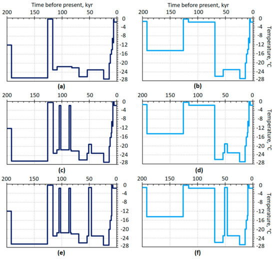 Construction of a paleotemperature scenario for the extraglacial area. The scenario allowing for setting the upper boundary conditions when modeling (Figure 6a,c,e) was established based on the methodology in [10,11]. We used the studies, which made it possible to reconstruct the temperature conditions of sedimentation on the New Siberian Islands and the coastal lowlands of northern Yakutia within the different time intervals [46,47,49,50,52,53,65].