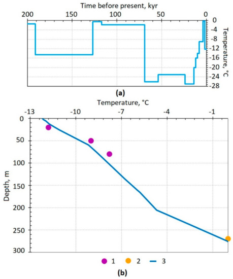 The geological section, required for solving Stephan’s task, in the upper 80 (borehole c-B) and 200 m (borehole c-A) was set by the drilling results, and below—following the geological survey data summarized in [55,56,72]. According to the geothermal observations in borehole c-B (located at the southwestern tip of the New Siberia Island), the average annual temperature was −11.5 °C, the temperature at the bottomhole was −7.6 °C. The permafrost thickness, calculated from the geothermal gradient is 250–255 m [71,73]. The paleotemperature curve and the results of test modeling are shown in Figure 7. Correction of rock properties allowed us to obtain correspondence between the field and estimated data.