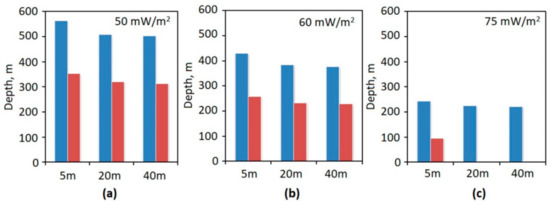 Shelf permafrost under the extraglacial (blue bars) and glacial conditions (red bars) on 5, 20, and 40 m isobaths. Modeling results for the recent period with the heat flux: (a) 50 mW/m2; (b) 60 mW/m2; (c) 75 mW/m2.