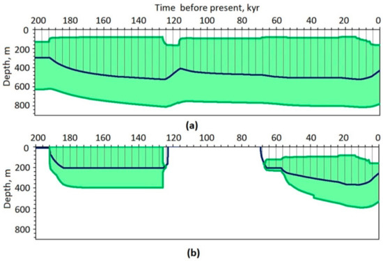 The boundary condition on the surface of the bottom sediments (3) is determined by the transgressions–regressions periods with due account for the sea level changes, as well as by glacial conditions having existed over the last 200,000 years. Curves of temperature changes on the surface of the bottom sediments, used for modeling submarine permafrost, are shown below in Section 4.2. The geothermal flux intensity was taken equal to G = 50, 60, or 75 mW/m2, depending on the numerical calculation, which corresponds to the values of the heat flux for this region [44,45].