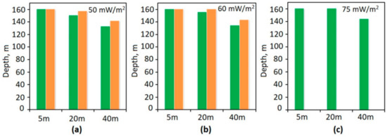 The modeling results for the extraglacial and glacial conditions by the scenario (Figure 6) under the heat flux of 50, 60, and 75 W/m2 are shown in Figure 8 for areas of 5, 20, and 40 m isobaths. Figure 8 shows the dependence of the depth of the permafrost bottom surface (thickness) on the geothermal flux, sea depth (isobaths), and the geological development history (glacial, extraglacial conditions).
