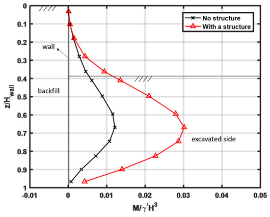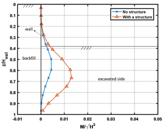 In Figure 10a, the bending moment variations through time instants 1 to 4 during an earlier cycle for both cases of “wall-only” and “structure on the backfill” are presented. There is no great reversal of bending moments, as the retaining wall is locked into a particular curvature due to the soil. However, the peak bending moment does increase from time point 1 to 4, with small drops in value at time points 2 and 3. This is due to the direction of soil acceleration and ensuing changes in dynamic earth pressure. The accumulation of bending moments can continue with the increasing number of loading cycles throughout the earthquake loading. This is illustrated in Figure 10b, in which the bending moment variations are plotted for a later loading cycle at time points 5–8. In this figure, it can be seen that the peak bending moments for both cases (i.e., with and without the structure on the backfill) increased relative to the earlier cycle presented in Figure 10a. The retaining wall can accrue more deflections away from the backfill during the dynamic loading but cannot move back into the soil. This is why the bending moments can either increase when deflection of the wall increases (and, hence, the curvature of the wall increases) or can remain the same but can never decrease by a significant amount.