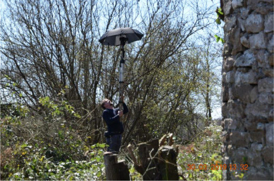 Architectural remains (towers and a temple) at the site were examined using photogrammetry methods. The photogrammetry was carried out from the ground directly by the authors of the article and a Nikon D5100 (Nikon Corporation, Tokyo, Japan) camera was used for photography. The shooting technique depended on the given height of the wall and the size of the object in focus. Usually, shooting was carried out in three rounds, with an offset of about 1 m in a circle, from eye level, with arms outstretched and shooting from a camera tripod raised to the maximum height (Figure 2).