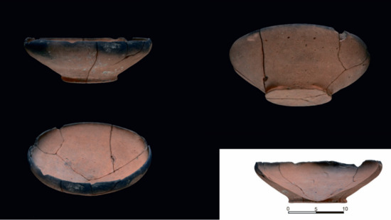 Explorations in the summer of 2020 made it possible to examine the area in more detail and confirm the possible location of the road on the site. It was determined that the road is a flat road along a rising hill on the one side and a precipice on the other, partly destroyed by abrasion. Two pits are located on the side of the road. The materials in the pits are comprised of large amounts of pottery and container ceramics from the first centuries AD. These are possibly vessels that have fallen from carts when travelling along the road towards the plateau. An unexpected finding was the handle of an Alanian camphor vessel dated between the 1st and 3rd centuries AD [12] (pp. 68–69), [13] (p. 79). Prior to this finding, Alanian materials have not found on the site. A uniquely preserved bowl found there was of particular interest, where analogs of the bowl have also been found among the Alans from the 1st to 3rd centuries AD as copies of Roman red-lacquered bowls [12] (p. 71), [13] (p. 16). The bowl itself was handed over to the Sukhumi State Museum; however, before that, a photogrammetric survey was carried out and a full 3D model was obtained for further processing of the material to support organizing virtual expositions based on the results of the work (Figure 4). In the future, there are plans to continue studying this road.