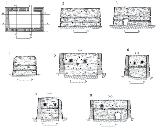 Drawings of the tower: (1) plan of the southern Alakhash-abaa tower; (2) north wall outside; (3) south wall outside; (4) east wall outside; (5) north wall, section A-A; (6) western wall, section B-B; (7) eastern wall, section V-V; (8) south wall, section G-G.
