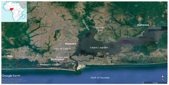 The study area is located at the Gulf of Guinea in the State of Lagos, Nigeria. The city Lagos is a west African megacity [27] with a large and strongly growing population estimated at 17 million inhabitants [28] and projected to reach 88.3 million by 2100 [29]. The lagoon of Lagos borders the city of Lagos. With an estimated length of 50 km, width of 3–13 km, and a total size of 6354.7 km2 [30], the lagoon is the fourth largest lagoonal system of the Gulf of Guinea. The two larger rivers Ogun and Osun discharge into the lagoon. Several channels and the Badagry creek connect the lagoon with Cotonou, Benin in the west, and with the Lekki lagoon to the east. A 2–16 km wide beach barrier separates Lagos Lagoon off the Gulf of Guinea. Badagry creek has its confluence with the lagoon in its southwestern part where they discharge into the Gulf of Guinea (Figure 1).