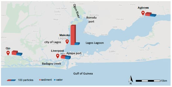 One consequence of the exponential increase in plastic production worldwide is the presence of plastics in the marine environment. Rivers are responsible for the majority of the plastic input into the oceans. In order to draw conclusions about Nigeria′s plastic input, this study was carried out to demonstrate the pollution caused by MPs in the Lagos Lagoon and the adjacent rivers. Plastic contamination of the water bodies could be determined by taking samples at different water bodies. Within the sediments, comparatively more microplastics were found in the fine-grained sediments of Makoko (2319 particles/kg) than in the sandy three other sites (310–410 particles/kg). This clearly shows that MPs dominate the finer grain sizes and that the high amount of particles points to a sink of MPs in sediments. However, as only four samples were analysed in both sediment and water, a more detailed investigation with more samples is absolutely necessary for further studies.