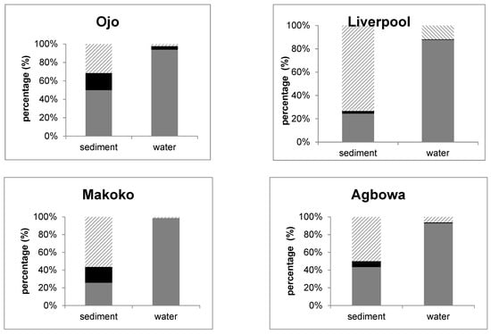 Four different sites were sampled along the Lagos Lagoon (Agbowa and Makoko) and further to the west (Ojo and Liverpool) (Figure 1). The sampling sites Makoko and Agbowa are located inside the Lagos Lagoon. Makoko [31] on the western side is characterised by stilt houses. Ojo lies upstream of Badagry creek 37 km to the west of Lagos city and Liverpool/Apapa with the main harbour of the agglomeration of Lagos further downstream. Badagry creek was sampled upstream and at the site Liverpool, close to the embouchure into Lagos Lagoon.
