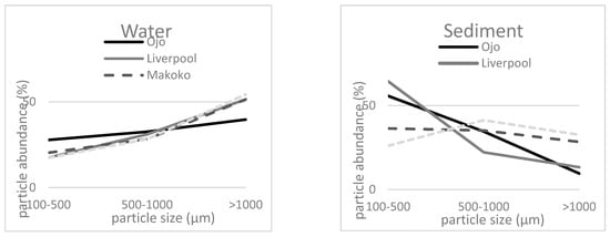 Tentative MPs were differentiated into three size classes 100–500 μm, 500–1000 μm, and 1000 μm. The size of the tentative MPs reveals contradictory results in the two compartments: more particles with a larger size were counted in the water phase (Figure 4). With the exception of Agbowa, more particles with a smaller size were present in the sediments.