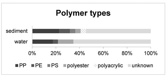 The polymer content also reveals differences between the compartments. Polypropylene (PP), polyethylene (PE), and polyester were the most common polymers in the water samples. Sediments were characterised by a more diverse polymer distribution (PP, PE, polyester, PS, and polyacrylic). This has been confirmed by other studies [32,68,69,70]. The higher diversity in the sediments can be explained by many polymers with a density 1 g/cm3 as well as weathering, biofouling, or the formation of hetero-aggregates [63,64,65].
