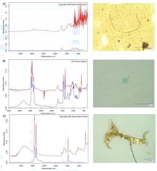 µFTIR spectra (red: measured spectrum, blue: reference spectrum from the Bruker spectral database) of analysed microplastics: (a) red polyester fibre, (b) green polypropylene fragment, (c) transparent polyethylene foil.