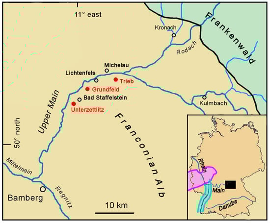 - Schirmer, W. Der Marktzeulner Paläomäander der Main-Formation. Jahresber. Mitt. Oberrh. Geol. Ver. 2013, 95, 391–420. [Google Scholar]