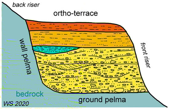 A strath terrace with sparse relics of an eluvial flument corresponds to the ground-pelma terrace (Figure 5). A strath terrace with thinner or thicker aggradational cover is a normal flument terrace. The use of the name “strath terrace” for a flument overlying the bedrock is a frequently applied case in American literature. Yet, Easterbrook [] does not involve it into his system of terraces at all.